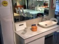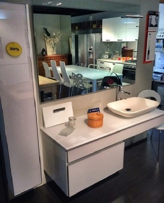 Bagno Artesi mod.Onyx, frontali in vetro cm.142 più colonna larghezza cm.45, sospeso con top in vetro e lavabo in ecotek in appoggio, completa di specchiera retroilluminata cm.140 (escluso il miscelatore), sconto 50% euro 2100,00