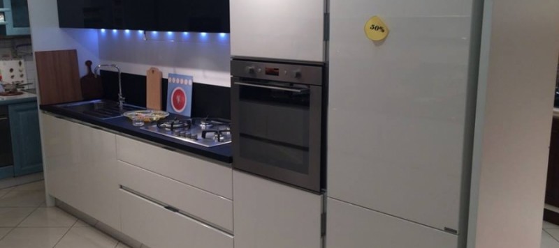 Cucina Dibiesse Horizon, laccato lucido, top in laminato, larghezza cm. 363, sconto 50% euro 6500.