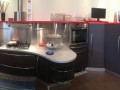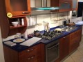 Snaidero Smeraldo in legno ciliegio con corpo avanzato, piano in quarzo blu cobalto, completa di elettrodomestici escluso frigorifero, larghezza cm.330, sconto 50% euro 7000,00